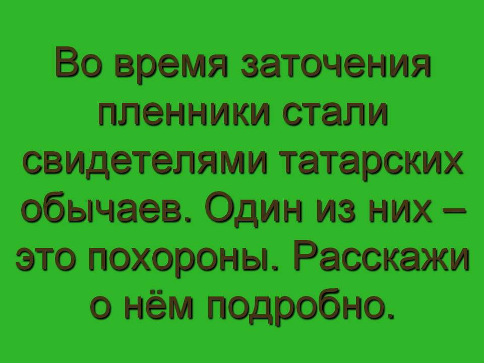 Зелёная. Во время заточения пленники стали свидетелями татарских обычаев. Один из них – это похороны. Расскажи о нём подробно. (Бывало, Жилин видел, татары приезжали весёлые, пригоняли с собой скотину. «А на этот раз ничего не пригнали и привезли на седле своего убитого татарина, брата рыжего. Приехали сердитые, собрались все хоронить…. Завернули мёртвого в полотно, без гроба, вынесли под чинары за деревню, положили на траву. Пришёл мулла, собрались старики, полотенцами повязали шапки, разулись, сели рядком на пятки перед мёртвым. Спереди мулла, сзади три старика в чалмах рядком, а сзади их ещё татары. Сели, потупились и молчат. Долго молчали. Поднял голову мулла и говорит: «Алла!» (значит Бог). Сказал это одно слово, и опять потупились и долго молчали; сидят, не шевелятся. Опять поднял голову мулла: «Алла!»- и все проговорили: «Алла!» - и опять замолчали. Мёртвый лежит на траве – не шелохнётся, и они сидят как мёртвые. Не шевельнётся ни один. Потом прочёл мулла молитву, все встали, подняли мёртвого на руки, понесли. Принесли к яме; яма вырыта не простая, а подкопана под землю, как подвал. Взяли мёртвого под мышки да под лытки, перегнули, спустили полегонечку, подсунули сидьмя под землю, заправили ему руки на живот. Притащил ногаец камышу зелёного, заклали камышом яму, живо засыпали землёй, сровняли, а в головы к мертвецу камень стоймя поставили. Утоптали землю, сели опять рядком перед могилкой. Долго молчали. Роздал рыжий денег старикам. Потом встал, взял плеть, ударил себя три раза по лбу и пошёл домой». На другой день зарезали кобылу. «Три дня ели кобылу, бузу пили - покойника поминали».)