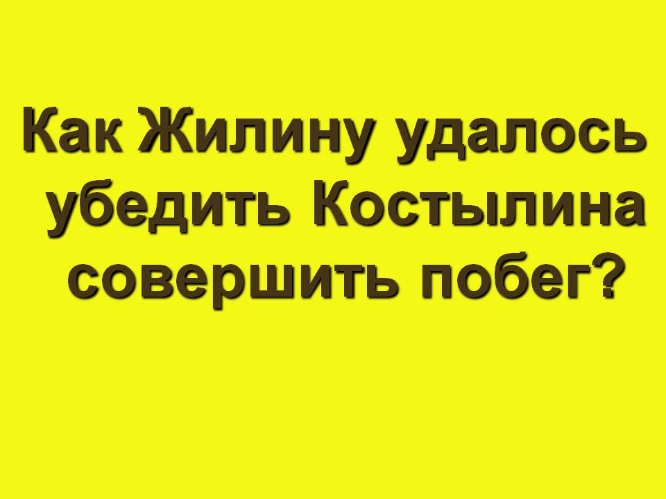Жёлтая дорожка. Как Жилину удалось убедить Костылина совершить побег? (После похорон Жилин решил, что надо бежать, и сказал Костылину. «А Костылин заробел. – Да как же бежать? Мы и дороги не знаем. Ж: - Я знаю дорогу. К: - Да и не дойдём в ночь. Ж: - А не дойдём – в лесу переночуем. Я вот лепёшек набрал. Что ж ты будешь сидеть? Хорошо - пришлют денег, а то ведь и не соберут. А татары злые теперь за то, что ихнего русские убили. Поговаривают - нас убить хотят. Подумал, подумал Костылин. – Ну, пойдём!»)