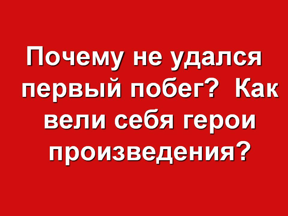 Красная дорожка. Почему не удался первый побег? Как вели себя герои произведения? (Во время побега Костылин показал себя слабым человеком. Он оказался не соратником Жилина, а обузой, он проявляет эгоизм, плохо переносит боль, усталость и только страдает. Жилин проявляет волю, мужество, находчивость, стойкость, активно борется за освобождение.)