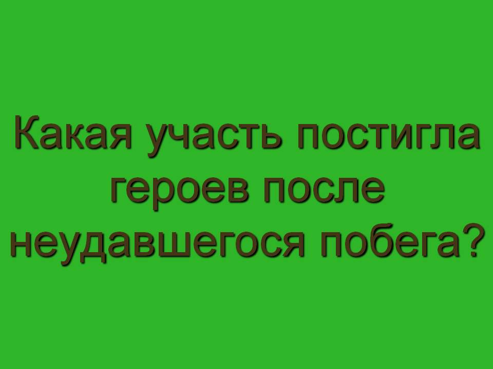 Зелёная дорожка. Какая участь постигла героев после неудавшегося побега? («Набили на них колодки, отвели за мечеть. Там яма была аршин пяти – и спустили их в эту яму. Житьё им стало совсем дурное. Колодки не снимали и не выпускали на вольный свет. Кидали им туда тесто непечёное, как собакам, да в кувшине воду спускали. Вонь в яме, духота, мокрота. Костылин совсем разболелся, распух, ломота во всём теле стала, и всё стонет или спит. И Жилин приуныл: видит – дело плохо. И не знает, как выбраться. Начал он было подкапываться, да землю некуда кидать; увидал хозяин, пригрозил убить».)