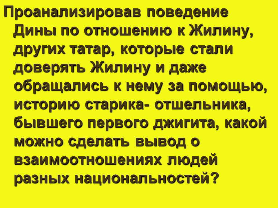 Жёлтая дорожка. Проанализировав поведение Дины по отношению к Жилину, других татар, которые стали доверять Жилину и даже обращались к нему за помощью, историю старика- отшельника, бывшего первого джигита, какой можно сделать вывод о взаимоотношениях людей разных национальностей? (Между народами не существует внутренней вражды, каждый народ имеет свои традиции, к которым должен с уважением относиться человек другой национальности, а война никому не нужна. Она несёт людям страдание и горе.)