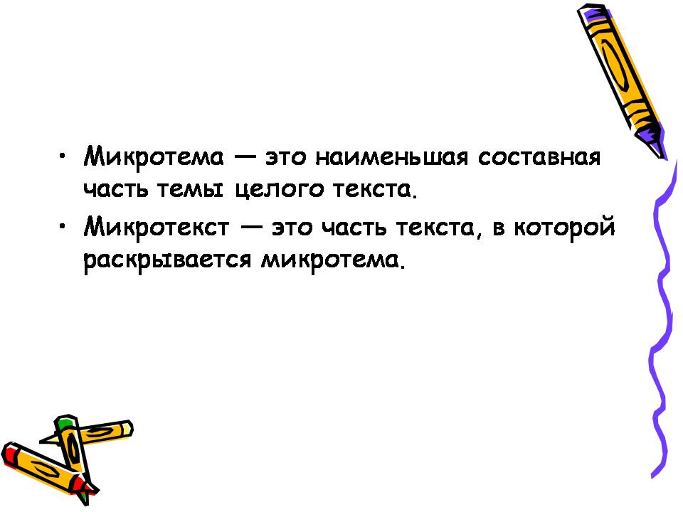 “Микро” (от греческого “малый”), часть сложных слов, указывающая на малую величину чего-либо? Итак, вы готовы дать определение понятия «микротема»? (выслушать ответы)
