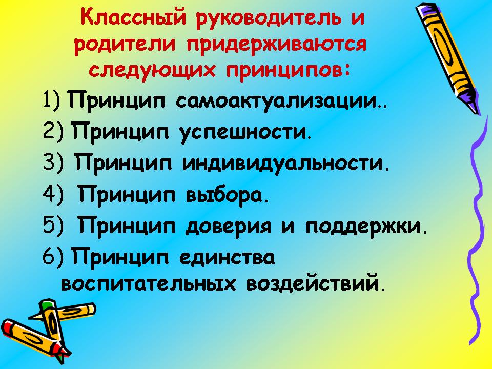 В-четвертых, учителю предоставляется возможность в процессе работы на уроке и вне его постоянно варьировать, видоизменять, корректировать работу с детьми, делать ее более осмысленной и продуктивной. В совместной воспитательной деятельности классный руководитель и родители придерживаются следующих принципов: