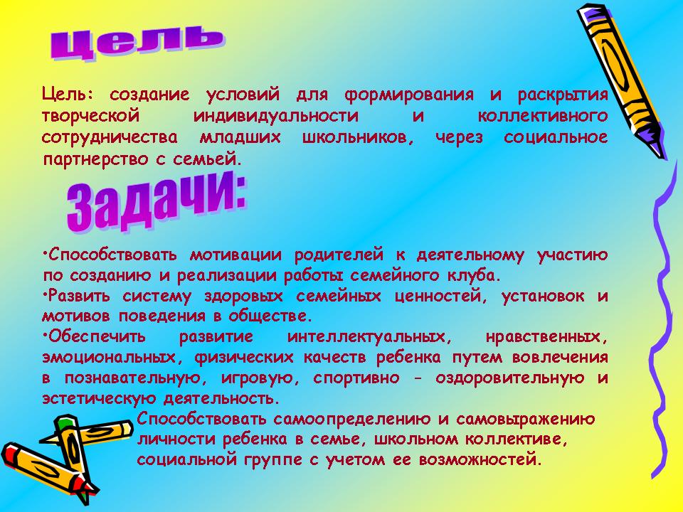 Цель: создание условий для формирования и раскрытия творческой индивидуальности и коллективного сотрудничества младших школьников, через социальное партнерство с семьей.