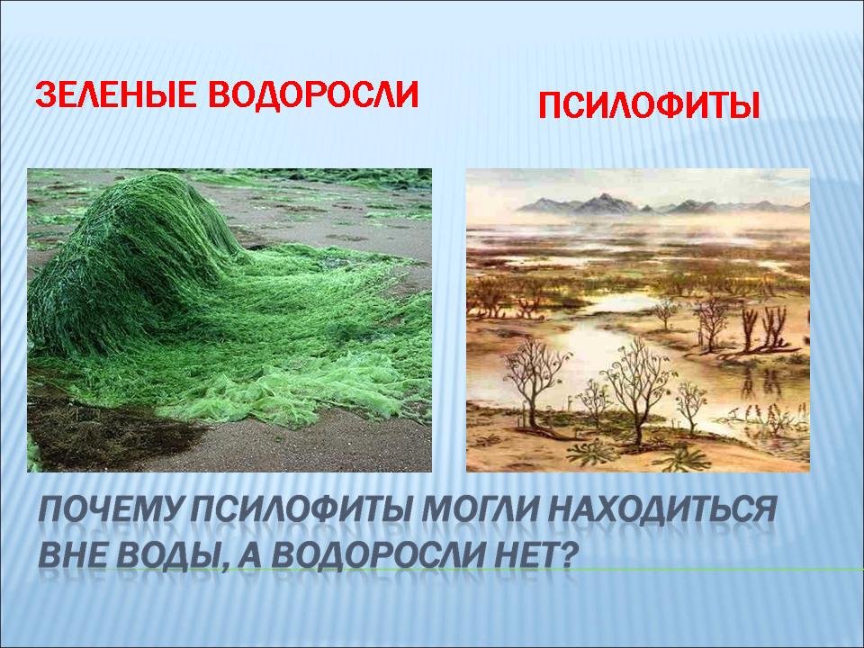 - Почему псилофиты могли находиться вне воды, а водоросли нет? (Слайд 13)