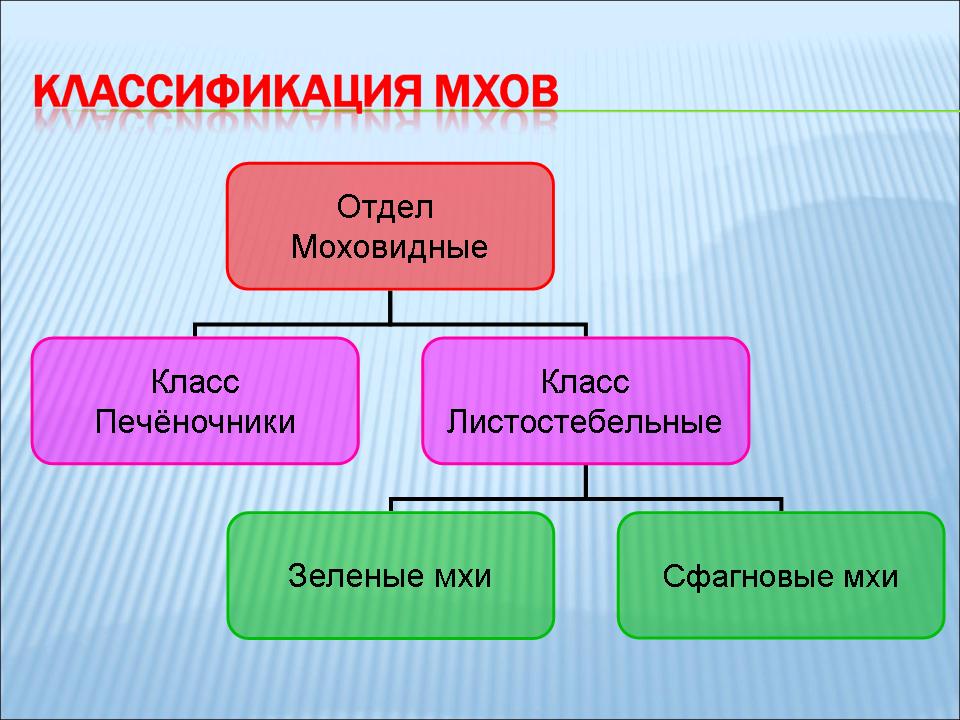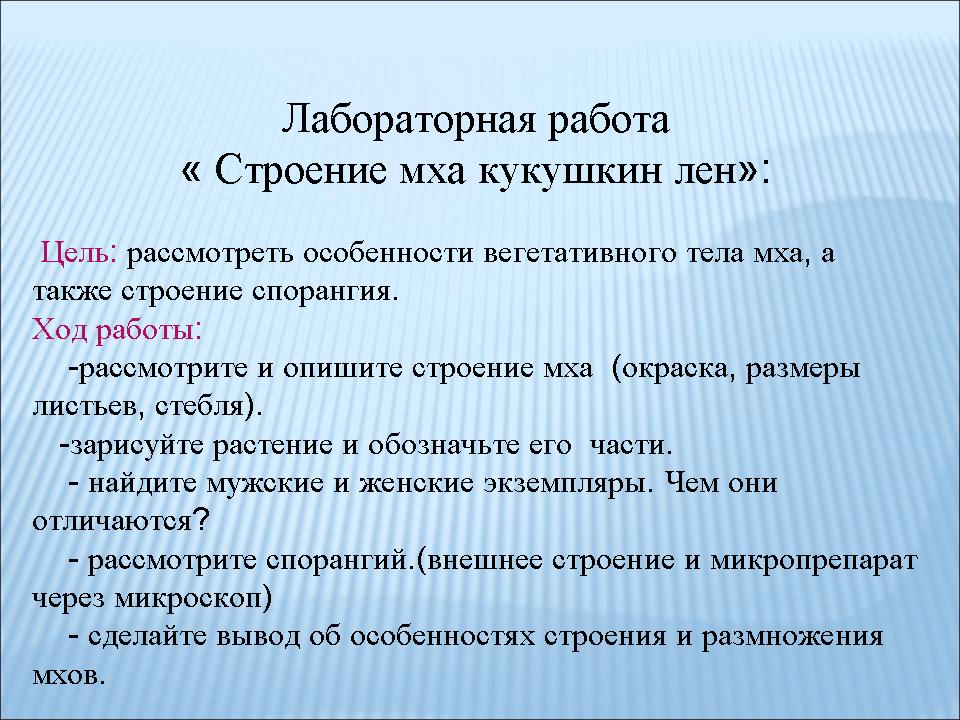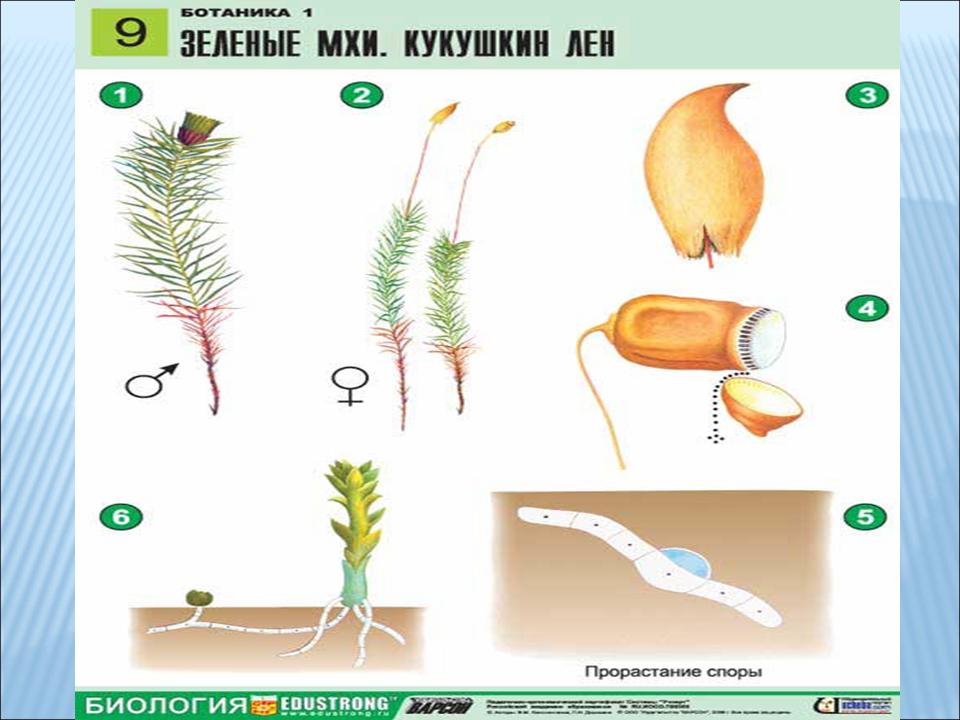 Цели урока: обобщить знания о ранее изученных отделах растений нестандартным методом, познакомить с классификацией мхов, изучить особенности строения кукушкиного льна, закрепить знания проведением лабораторной работы.