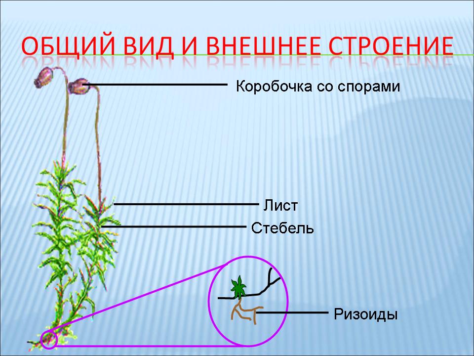 - Какие части вы можете назвать у мха? (Ризоиды, стебель с маленькими листьями, коробочка со спорами)