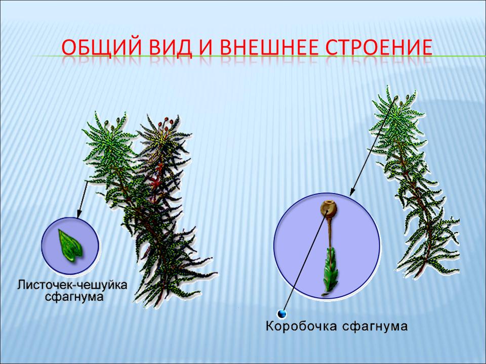 Сфагнум — многолетнее растение с сильно ветвящимся стеблем. В отличие от кукушкина льна и других зеленых мхов сфагнум не имеет ризоидов. Стебель и ветви покрыты мелкими светло-зелеными листьями.