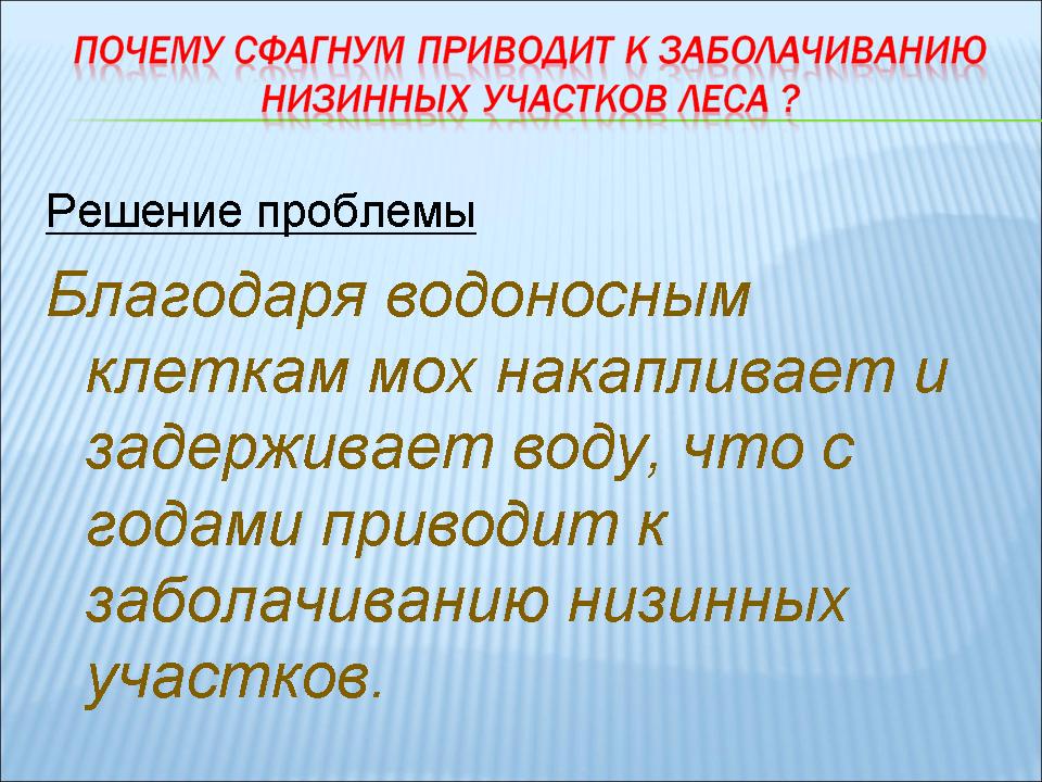 Решение проблемы. Благодаря водоносным клеткам мох накапливает и задерживает воду, что с годами приводит к заболачиванию низинных участков. (Слайд28)