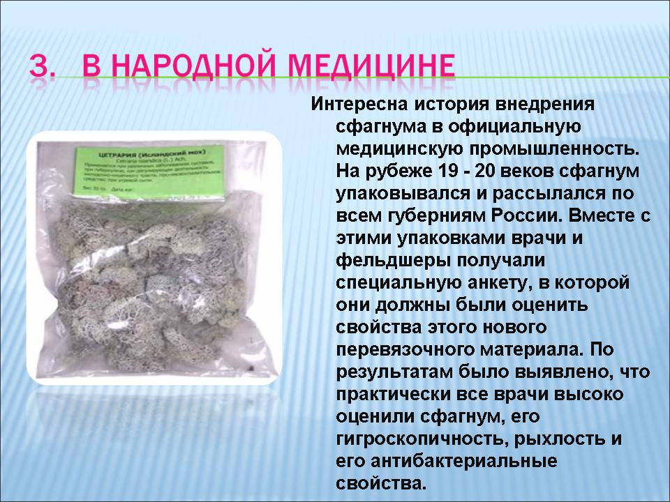 Интересна история внедрения сфагнума в официальную медицинскую промышленность. На рубеже 19-20 веков сфагнум упаковывался и рассылался по всем губерниям России. Вместе с этими упаковками врачи и фельдшеры получали специальную анкету, в которой они должны были оценить свойства этого нового перевязочного материала. По результатам было выявлено, что практически все врачи высоко оценили сфагнум, его гигроскопичность, рыхлость и его антибактериальные свойства.