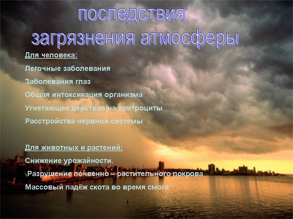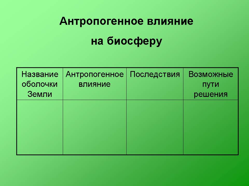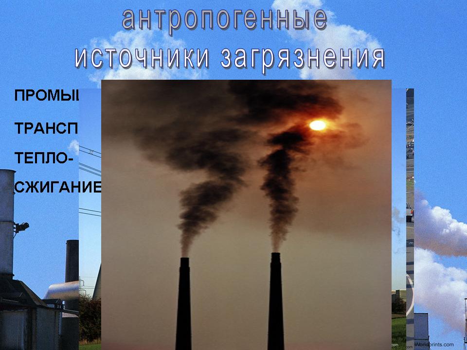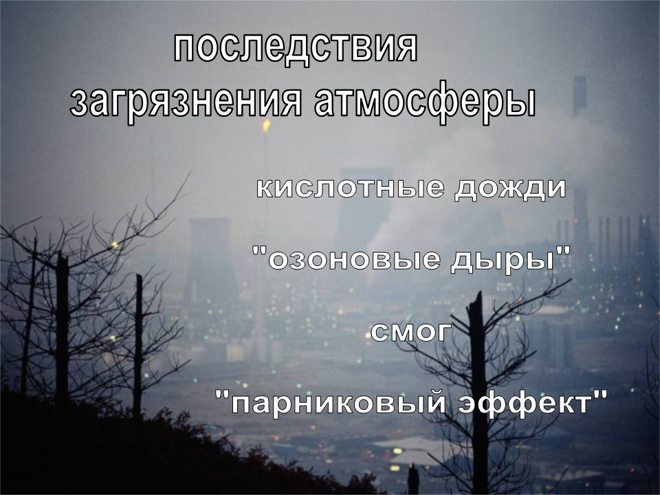 - антропогенное загрязнение, его влияние и последствия (кислотные дожди, смог, озоновые дыры, парниковый эффект).