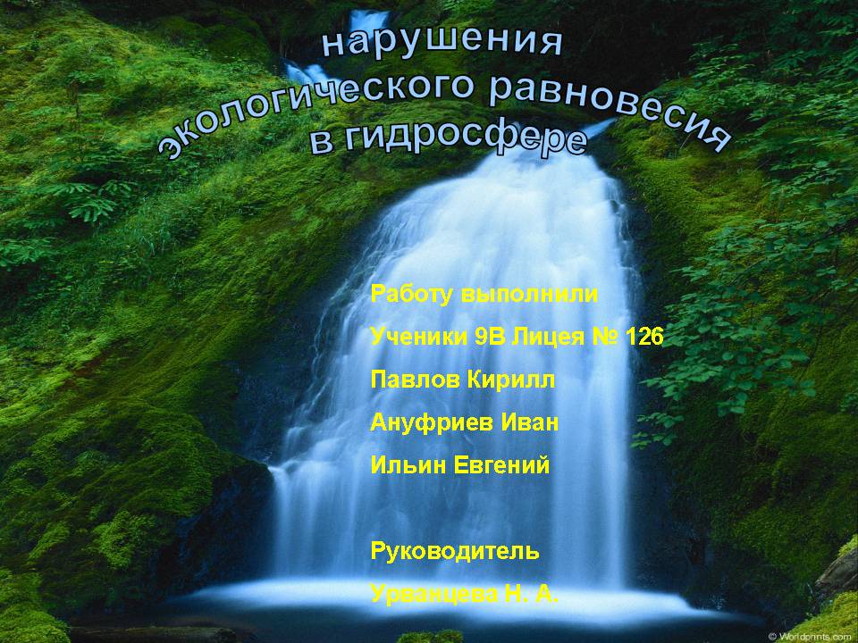 Следующая оболочка Земли, о которой мы сегодня поговорим – гидросфера. Презентацию на тему: “Нарушение экологического равновесия в гидросфере и возможные пути решения” представляют Ануфриев Иван, Ильин Евгений, Павлов Кирилл. (Cлайды 17-30)