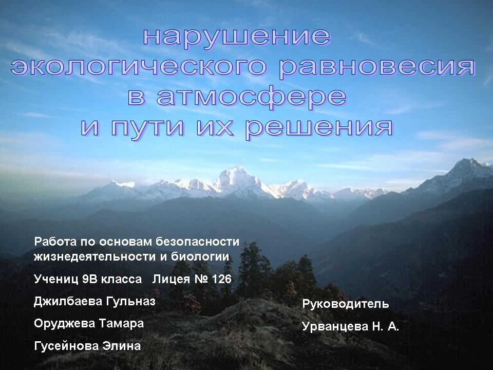 Свою презентацию на тему “Нарушение экологического равновесия в атмосфере и возможные пути решения” представляют Джилбаева Гульназ, Оруджева Тамара и Гусейнова Элина. (Слайды 5-14) Слушая своих одноклассников, не забывайте заполнять графы таблицы, в соответствие с их названиями.