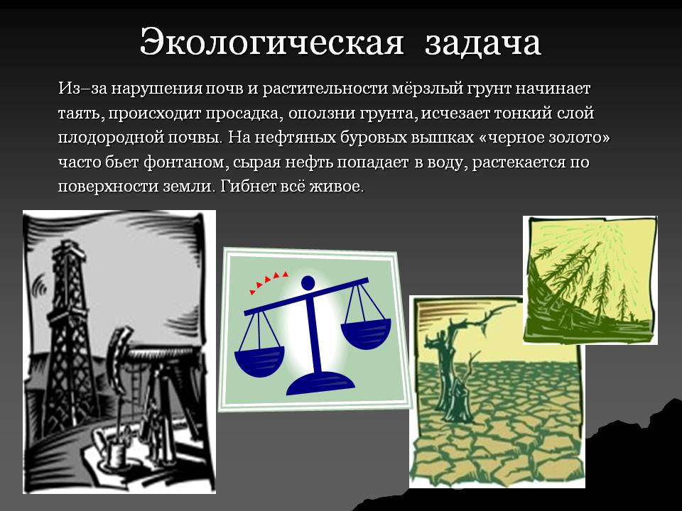 Учитель: (Сл. №13) Действительно, это нарушение природного равновесия характерно для нашего края. Ханты – Мансийский и Ямало – Ненецкий автономный округ главные газо - и нефтедобывающие районы страны, они дают около90% российского газа и более 50% нефти. Но освоение месторождений привели к тяжелым последствиям. Из–за нарушения почв и растительности мёрзлый грунт начинает таять, происходит просадка, оползни грунта, исчезает тонкий слой плодородной почвы. На нефтяных буровых вышках «черное золото» часто бьет фонтаном, сырая нефть попадает в воду, растекается по поверхности земли. Гибнет всё живое. Главная река региона Обь собирает и несёт загрязняющие вещества на север в Обскую губу и Карское море.