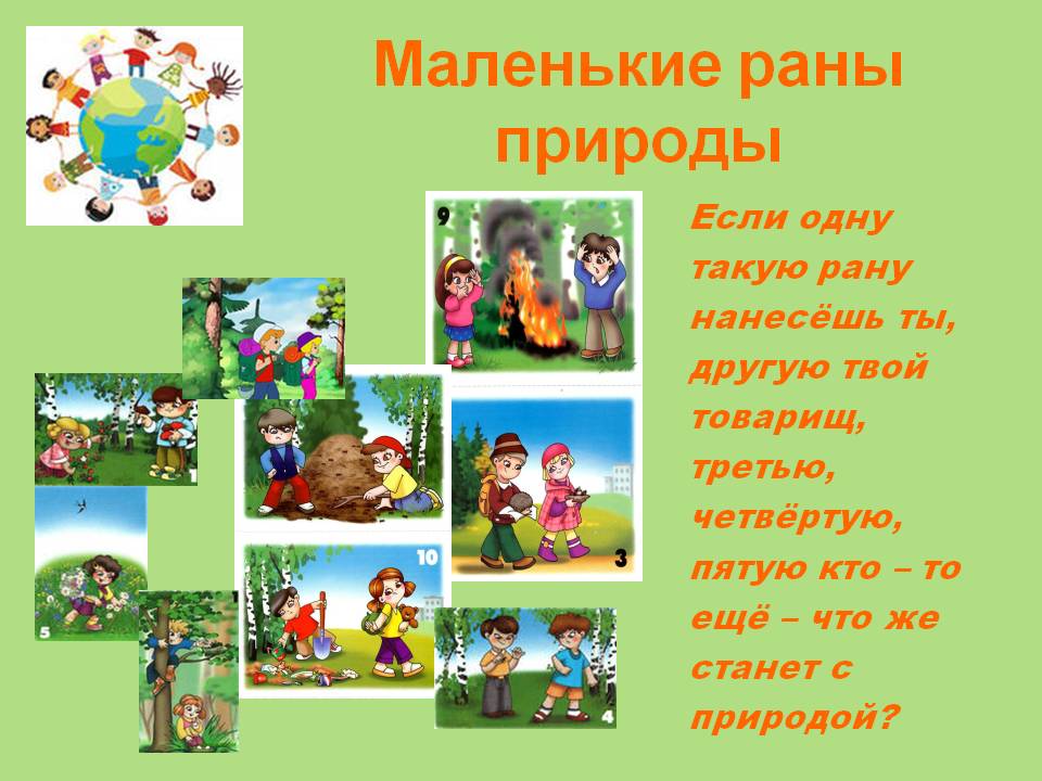 Нельзя ломать ветки деревьев и кустарников, срывать цветы, ловить бабочек, стрекоз и других насекомых, уничтожать лягушек и жаб. Но будет ли природа хуже, если ты, собирая орехи, сломаешь несколько веток или сорвёшь всего 3 – 4 цветка?