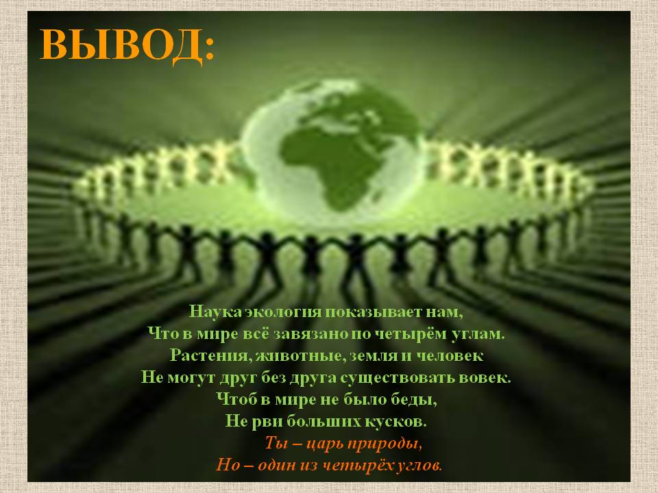 Учитель: Молодцы! Все на уроке хорошо потрудились. И в заключение предлагаю послушать небольшое стихотворение, в котором содержится очень важная для всего человечества мысль. Выделите эти строчки (Сл. №17).