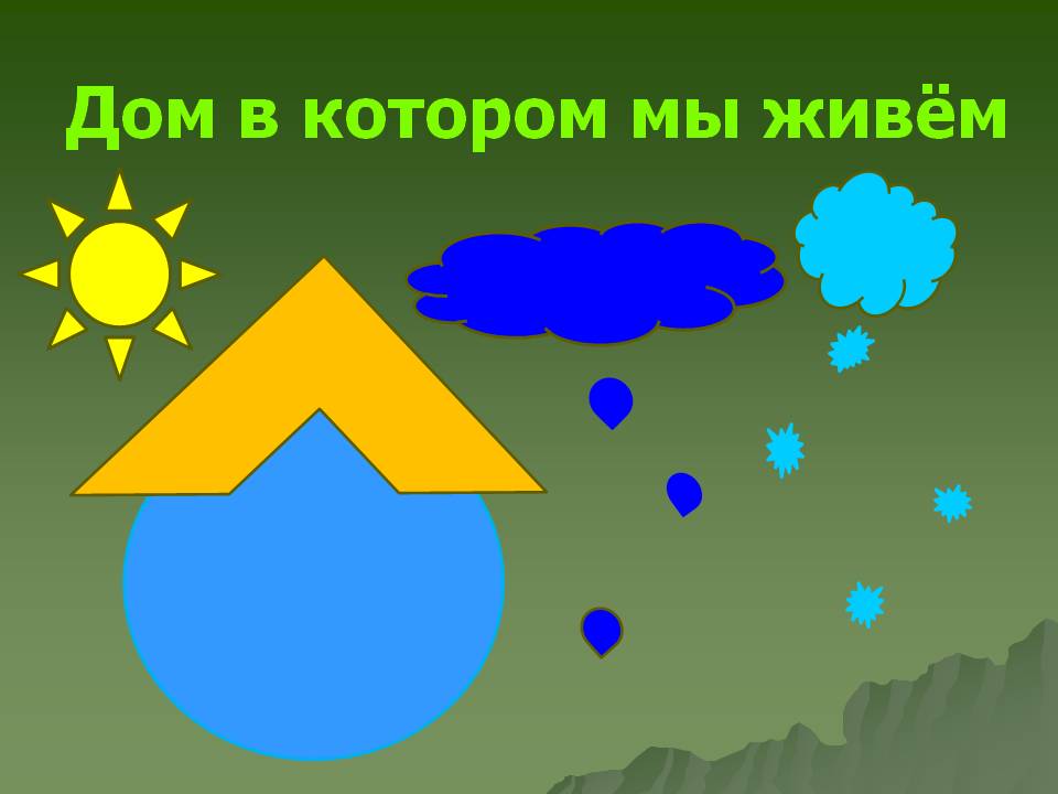 Учитель: Мы живём на планете Земля. Это – наш общий дом. У нас над головой общая крыша – голубое небо. У нас под ногами общий пол – земная поверхность, у нас одна на всех лампочка и печка – ласковое солнышко. У нас общий водопровод – это дождевые и снежные тучи. И вентилятор у нас тоже один на всех – ветер – ветрило.