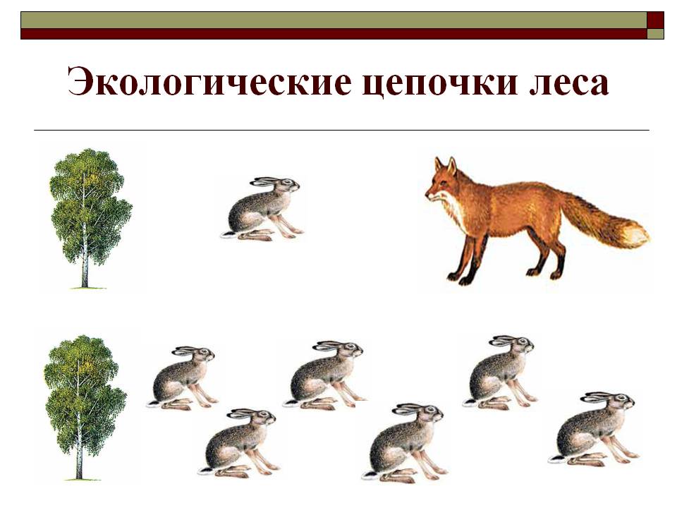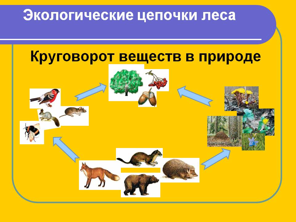 Учитель: А в природе всё устроено удивительно разумно и правильно. Проживающие вместе сообщества растений и животных образуют экологические цепочки (сл. № 6). Давайте посмотрим,как выглядит экологическая цепочка леса.