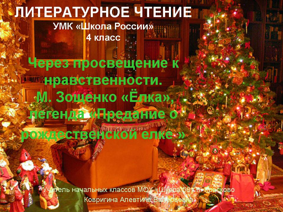- продолжить работу над произведением М. Зощенко «Ёлка», помочь понять смысл произведения; знакомство с легендой: «Предание о рождественской елке».