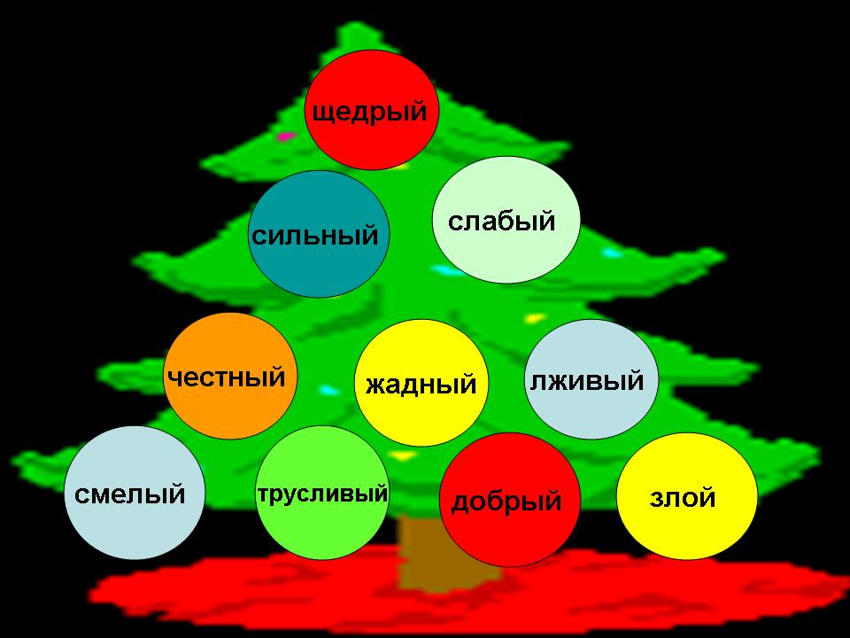 – А теперь попробуем подобрать антонимы к словам: сильный, честный, смелый, щедрый, добрый. (Слабый, лживый, трусливый, жадный, злой) (слайд 5)