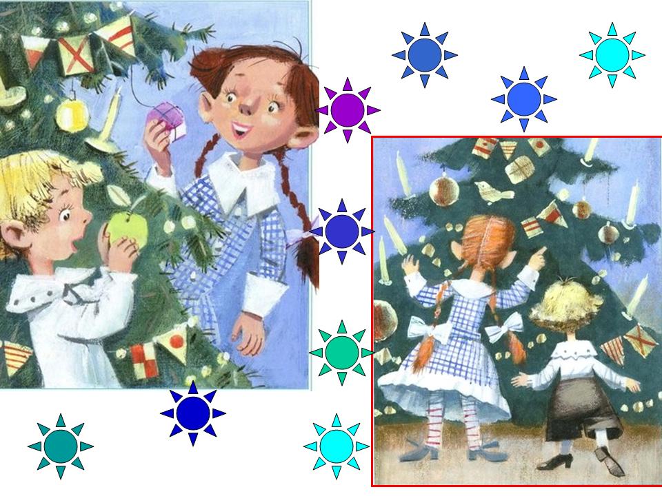 – Найдите в тексте М. Зощенко, описание елки. (Вот мы с сестрёнкой Лелей вошли в комнату. И видим: очень красивая ёлка. А под ёлкой лежат подарки. А на ёлке разноцветные бусы, флаги, фонарики, золотые орехи, пастилки и крымские яблочки.) (слайд 9)