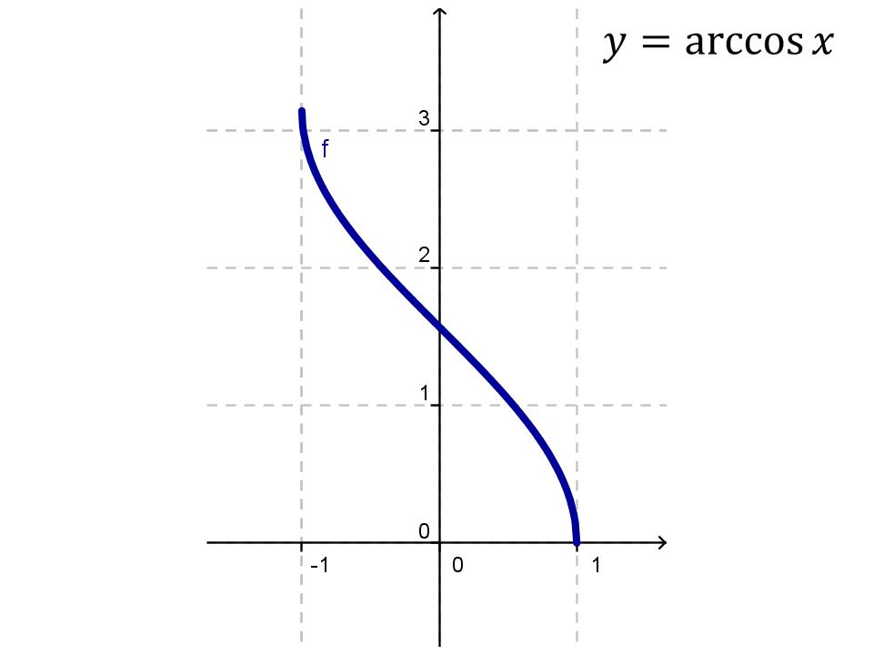 В геогебре строим график функции y=cosx. На промежутке от 0 до пи функция монотонная, убывающая, пробегает все свои значения от-1 до 1, обратимая. Назовем обратную функцию y= arccosx.