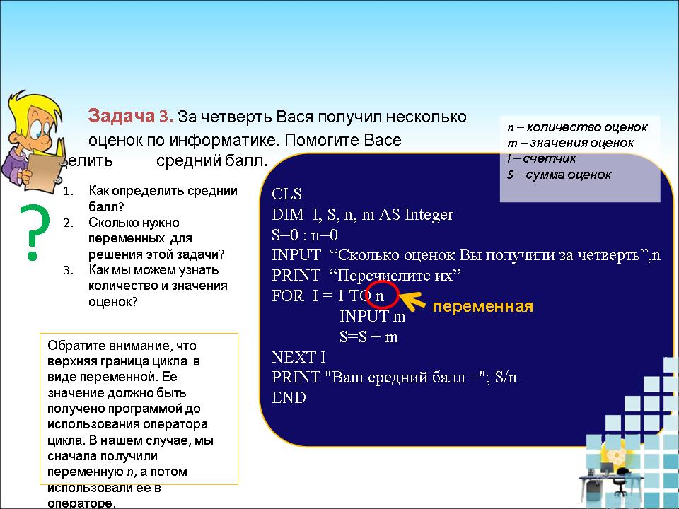 Как определить средний балл? (Ответ: нужно сумму всех оценок разделить на их количество)Сколько нужно переменных для решения этой задачи?( Ответ: 4)n – количество оценокm – значения оценокi – счетчикS – сумма оценокКак мы можем узнать количество и значения оценок? (Ответ: Спросить у Васи) Текст программы:CLS