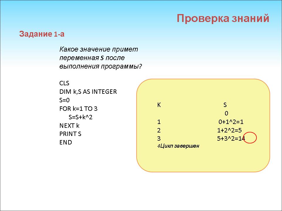 А) (Слайд 11) Какое значение примет переменная S после выполнения программы? CLS DIM k,S AS INTEGER S=1 FOR k=1 TO 3 S=S+k*2 NEXT k PRINT S END |