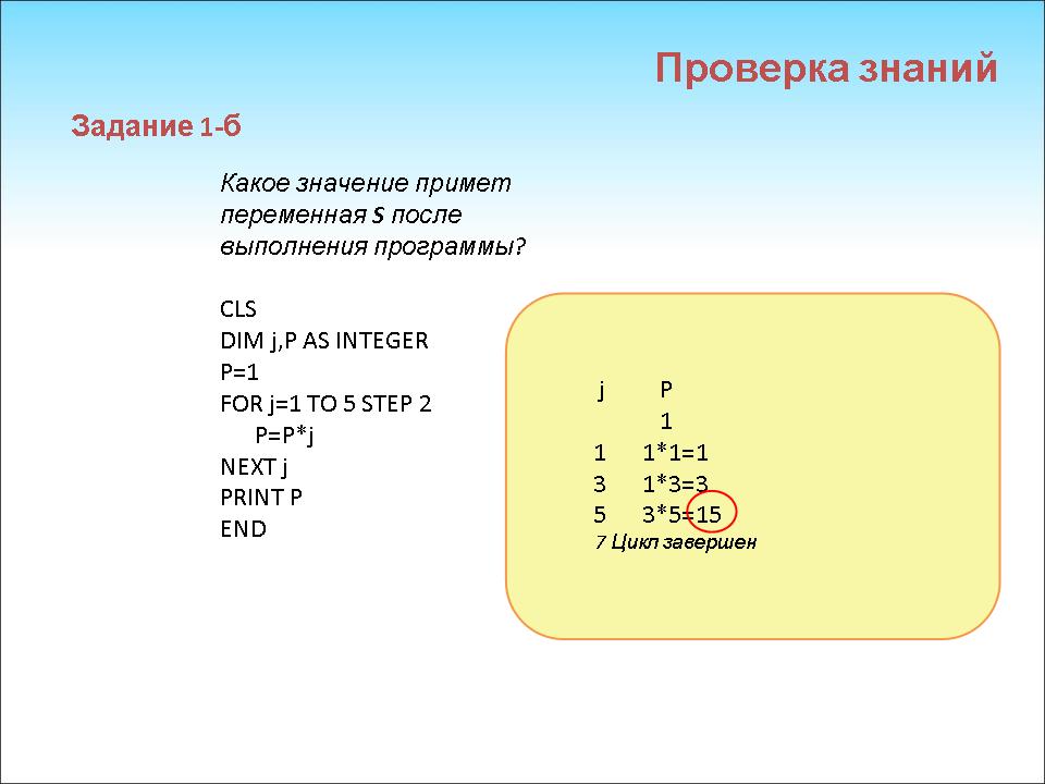 Б) (Слайд 12) Какое значение примет переменная Р после выполнения программы? CLS DIM j,P AS INTEGER P=1 FOR j=1 TO 10 STEP 3 P=P*j NEXT j PRINT P END |