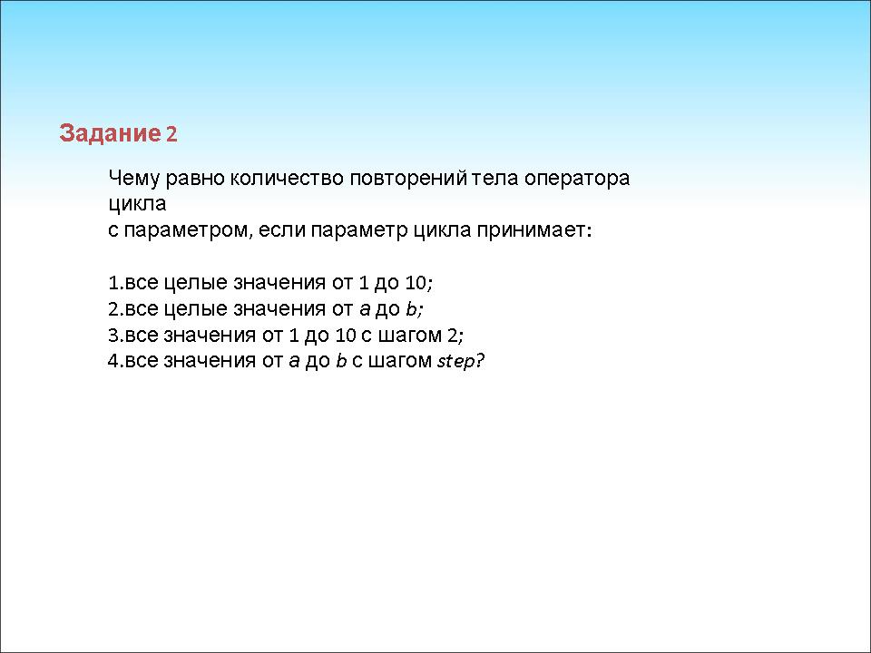 - Если конечное значение переменной цикла меньше начального значения, то цикл не выполнится ни разу.