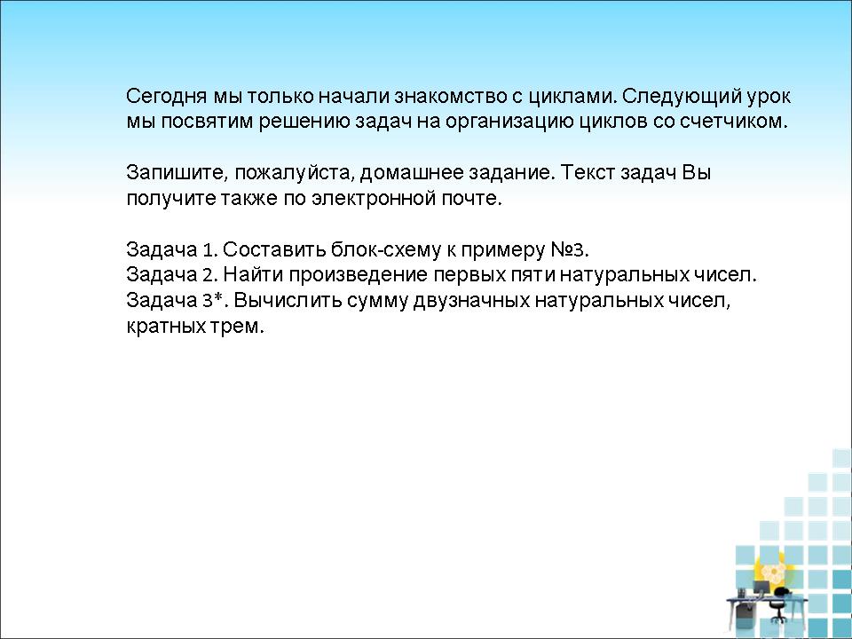 Сегодня мы только начали знакомство с циклами. Следующий урок мы посвятим решению задач, где логично использовать цикл с параметром.
