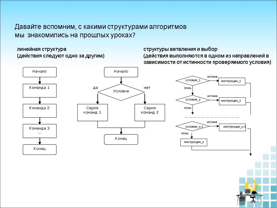 – Давайте вспомним, с какими структурами алгоритмов мы знакомились на прошлых уроках?