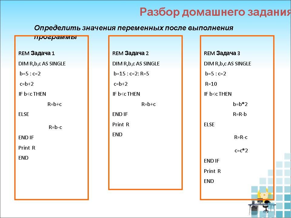 Оборудование: компьютерный класс, мультимедийный проектор, среда программирования QBasic.