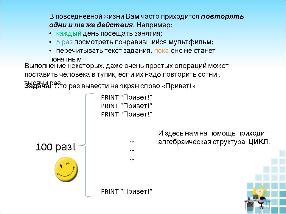 Например: Попробуйте сто раз вывести на экран слово «Привет!» Написать программу, использующую только оператор PRINT, проблематично (слайд 4).
