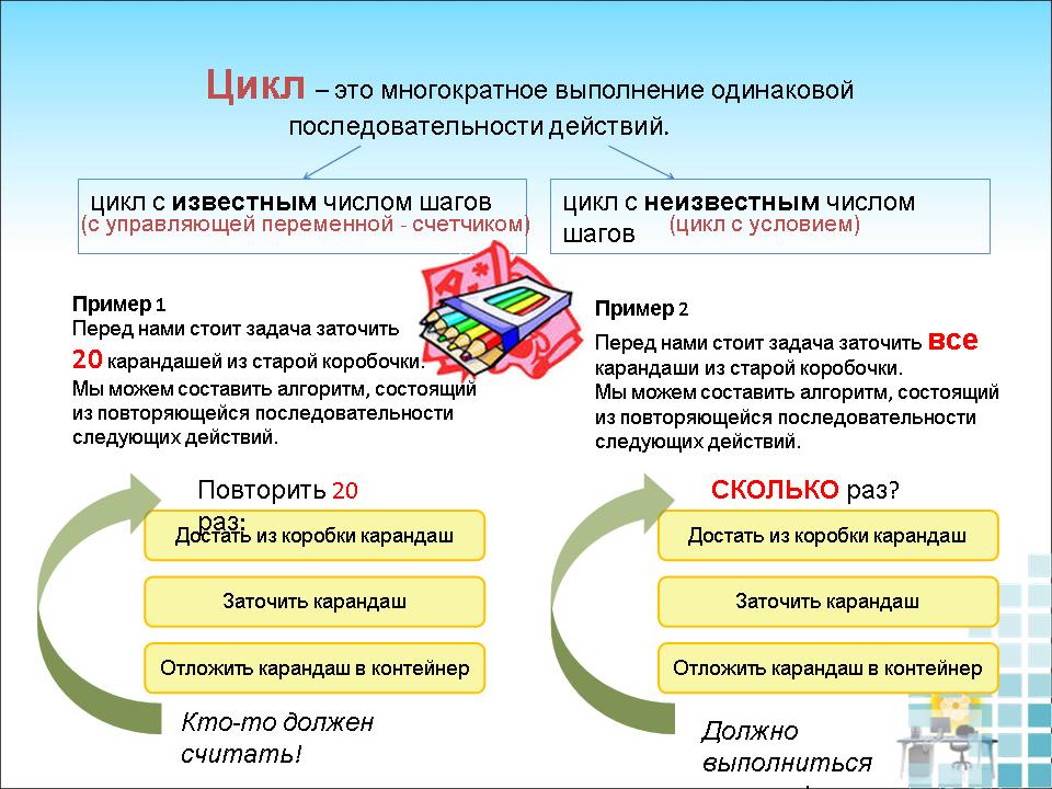 – А их количество нам неизвестно. Коробка вообще может быть пустой. Мы будем совершать действия, ЕСЛИ в коробке есть карандаши. Для того, чтобы действия совершались, необходимо выполнение УСЛОВИЯ. И эти циклы называются циклами с условием.