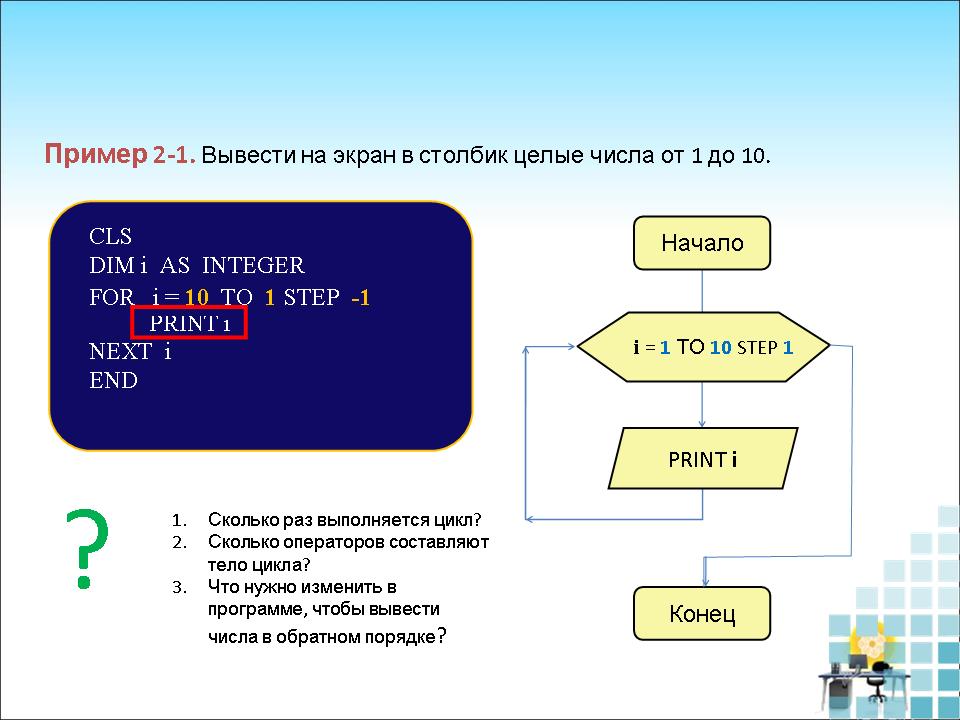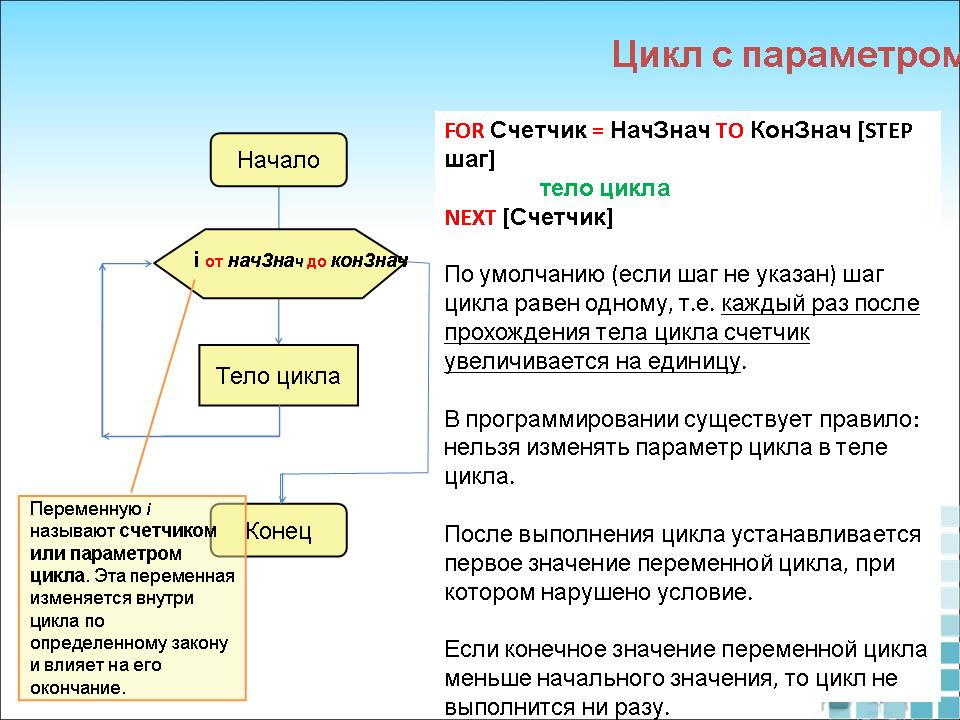 - Выяснить условия работы цикла с параметром.
