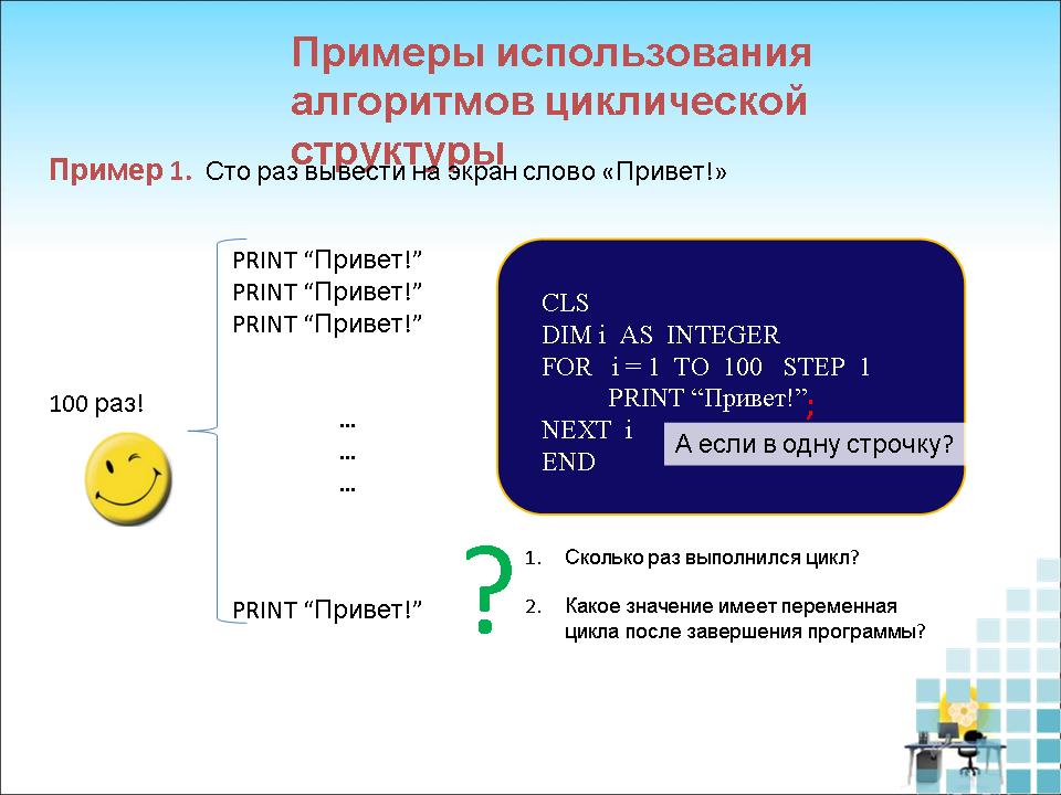 Вернемся к самой первой задаче, где нам предстояло сто раз вывести на экран слово «Привет!» (Слайд 7)