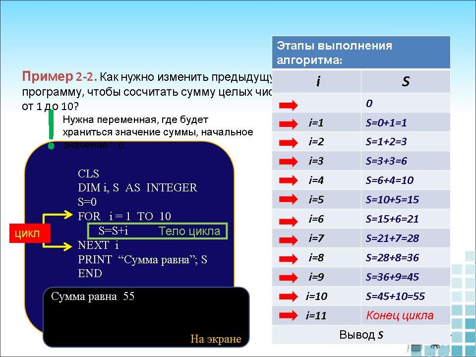 Пример 2-2. Как нужно изменить предыдущую программу, чтобы сосчитать сумму целых чисел от 1 до 10? (Слайд 9)