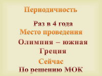 6 слайд .Периодичность. Игры проходили раз в 4 года. Сейчас проводятся по решению МОК.