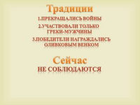 Современные олимпийские игры отличаются от античных. Они проходят во многих городах мира. С каждым годом олимпийских видов спорта становится больше . Олимпийцы стараются сохранять традиции, но не всегда это удаётся. Священное перемирие возродить не удалось.
