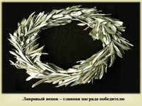 17 слайд. В пятый, заключительный день игр, награждали победителей. На их головы главный судья возлагал венки из ветвей оливы.