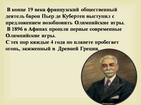 19 слайд. Возрождение Олимпийских игр связано с именем французского общественного деятеля барона Пьера де Кубертена.