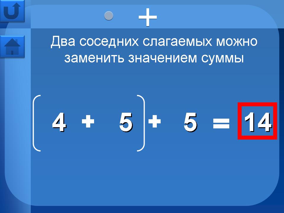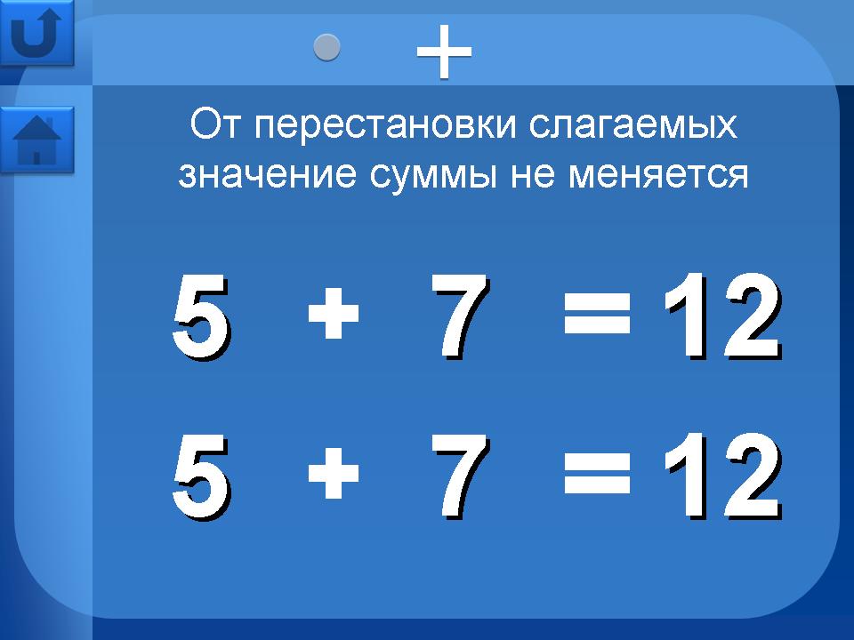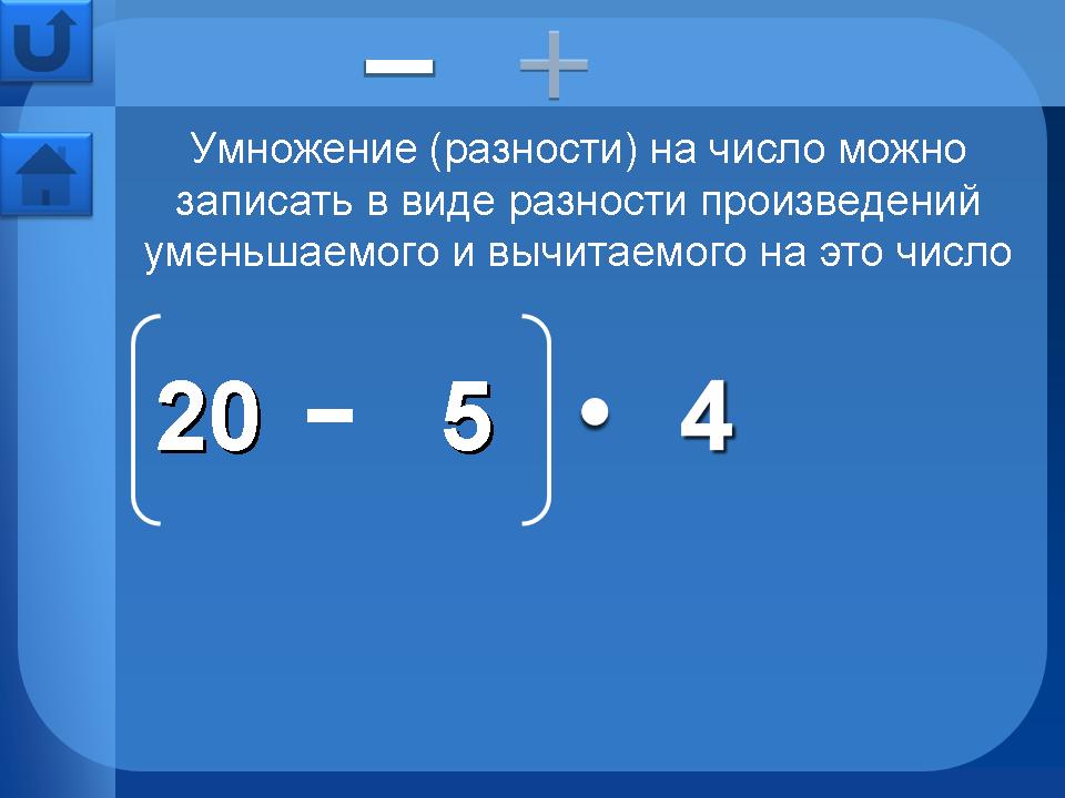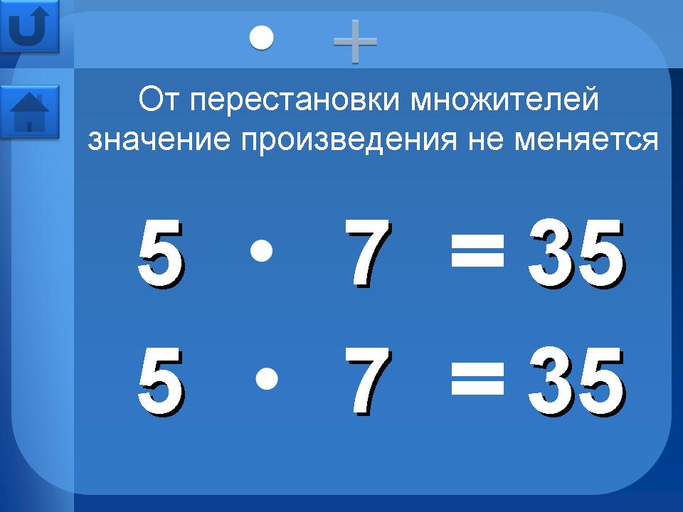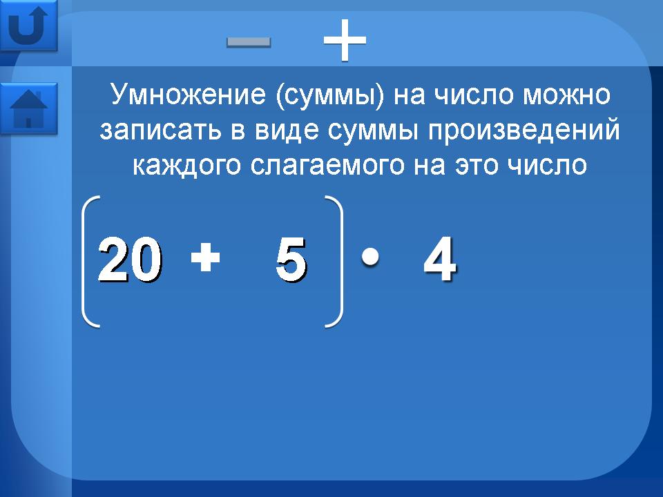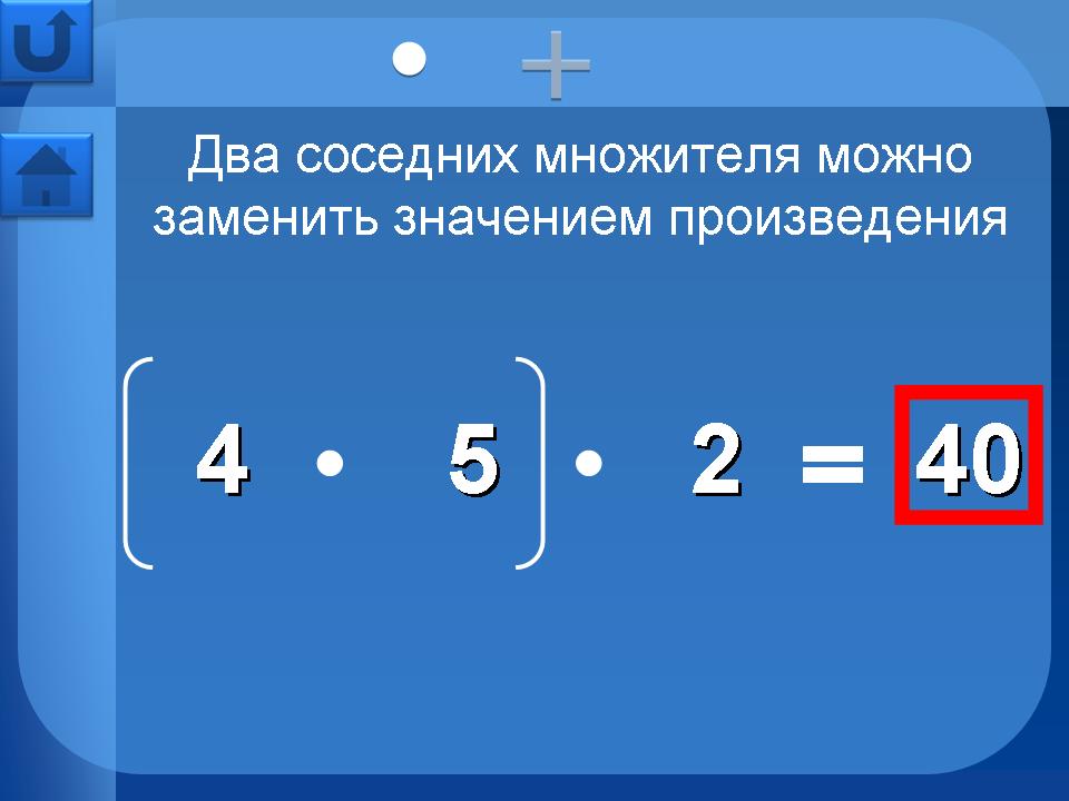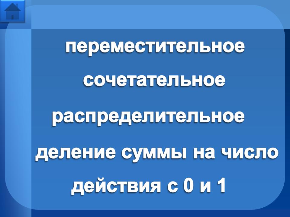 Страницы в разделе “Свойства арифметических действий” - сочетательное, переместительное, распределительное – имеют дополнительную навигацию в верхней части страницы. Это кнопки перехода на страницы свойств для умножения, сложения и т.д.