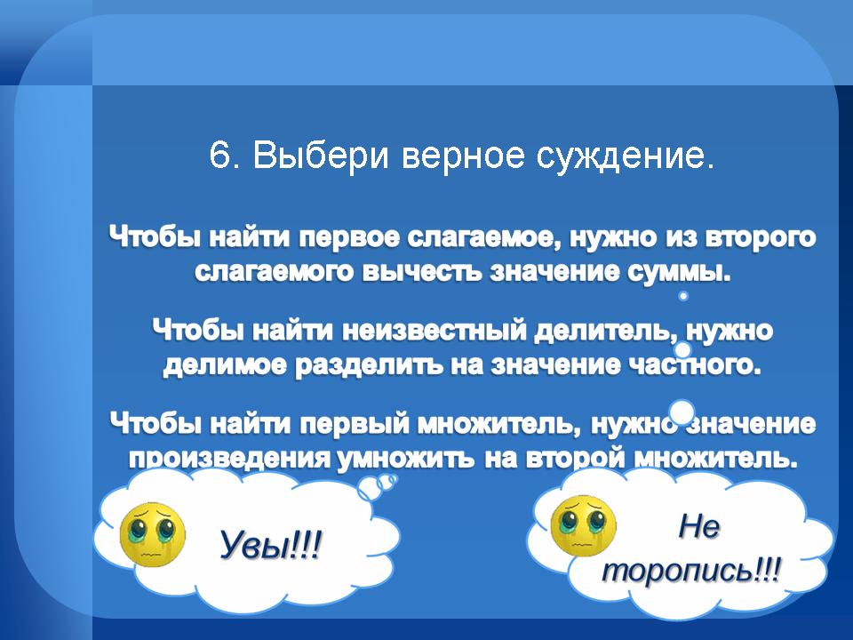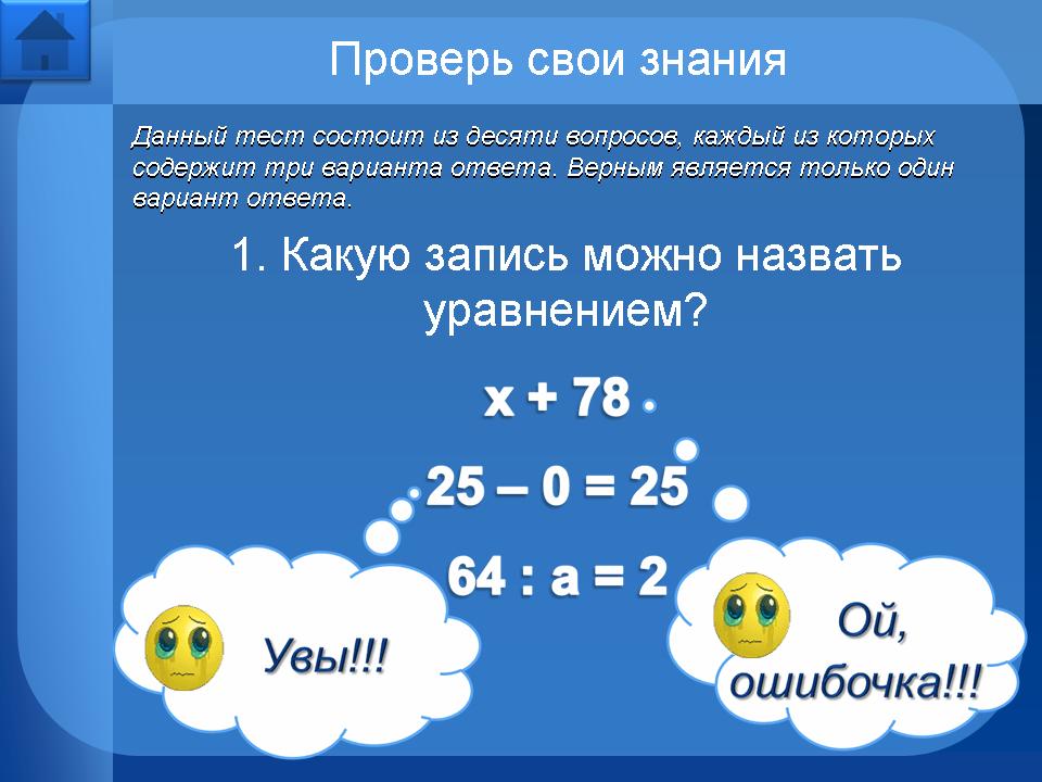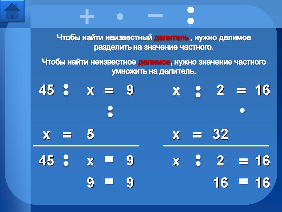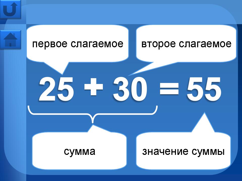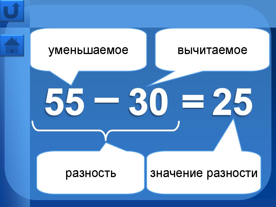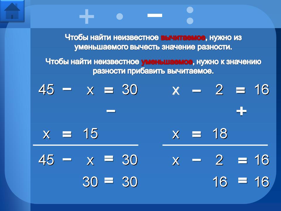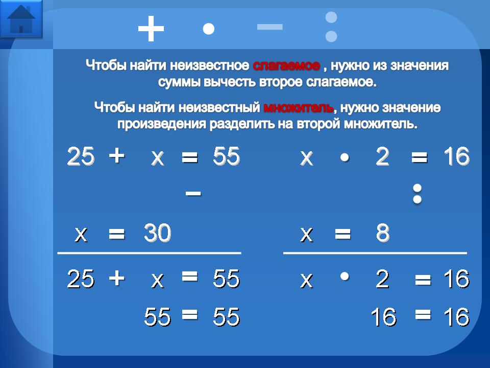 Например, рассмотрим уравнение на нахождение неизвестного слагаемого: при нажатии на текст правила, происходит мерцание “х”, тем самым показывая, что необходимо найти. Затем при нажатии на “х” происходит его движении вниз вместе со знаком “=”, т. е. постепенно выстраивается запись решения уравнения. Затем по правилу… чтобы найти неизвестное слагаемое, нужно из значения суммы… - нажимаем на значение суммы 55: запись продолжает выстраиваться … вычесть известное слагаемое… - нажимаем на известное слагаемое 25: запись выстраивается дальше. Появляется вновь мерцающий “х” - его нужно заменить корнем уравнения, кликнем на 30: решение уравнения приобретёт окончательную запись.