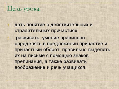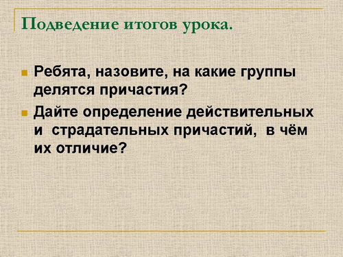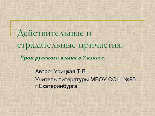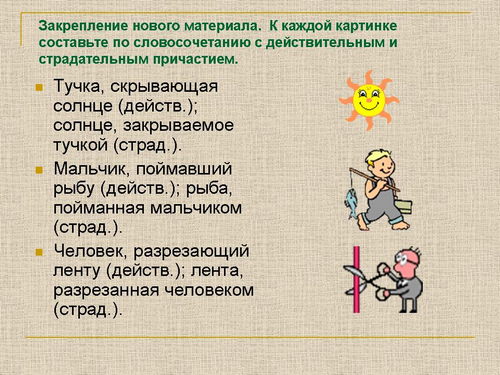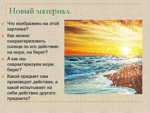 1). Слайд №5. Ребята, сегодня на уроке мы с вами узнаем, какие причастия называются действительными, а какие страдательными. Посмотрите на картинку. Что на ней изображено? Как можно охарактеризовать солнце по его действию на море, на берег? А как мы охарактеризуем море, берег? Какой предмет сам производит действие, а какой испытывает на себе действие со стороны другого предмета? Вы уже знаете, что причастие обозначает признак предмета по действию, а теперь подумайте, признак активного или пассивного, действующего или испытывающего на себе действие предмета обозначает действительное причастие? А страдательное?