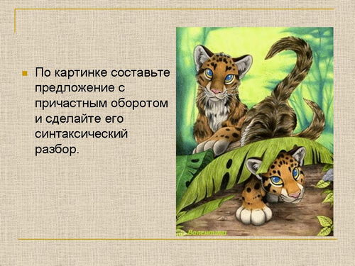 3). Слайд №4. По картинке составьте предложение с причастным оборотом и сделайте его синтаксический разбор. Учащиеся называют свои варианты предложений. Ученик, предложивший наиболее удачный вариант, идёт к доске, записывает предложение и делает синтаксический разбор.