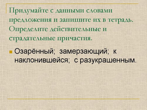 Слайд № 8. Учащиеся должны придумать со словами, предложенными на слайде, предложения и записать их в тетрадь, определить действительные и страдательные причастия.