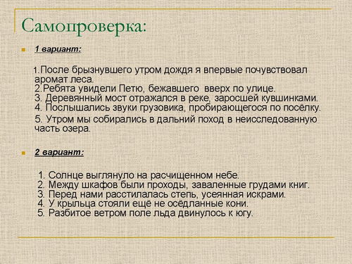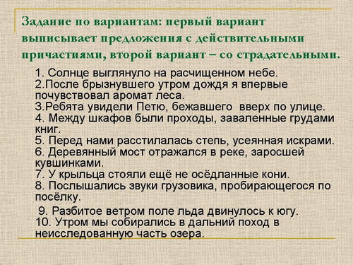 Слайд №9. Задание выполняется по вариантам: первый вариант выписывает предложения с действительными причастиями, второй вариант - со страдательными.