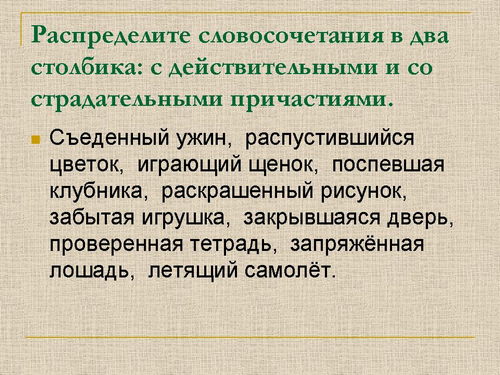 Слайд №11. Задание для самопроверки. Надо распределить словосочетания в два столбика: с действительными и со страдательными причастиями: