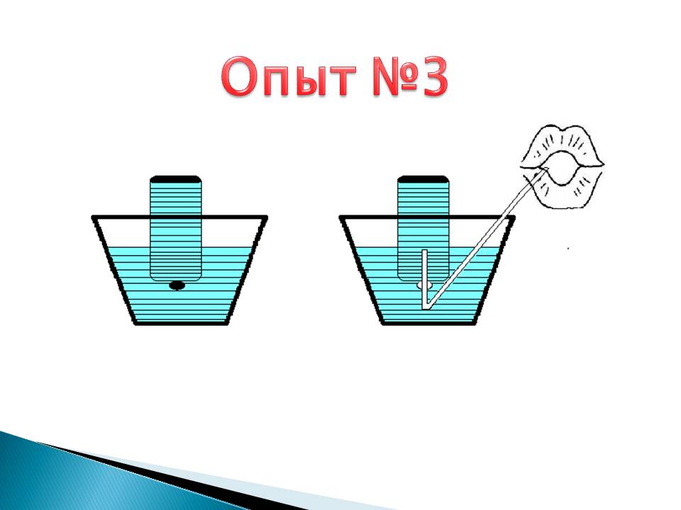 Воспитатель: Перед нами лежат бутылочки, полностью наполненные водой. Возьмите их, опускайте бутылочку горлышком вниз в таз с водой, снимите крышку, и под водой вставьте соломинку в бутылочку. Наберите побольше воздуха в легкие и дуйте изо всех сил в соломинку. Воздух из легких поступает в бутылочку и вытесняет воду, т. е. в бутылочке образуется пустота. Чем больше воздуха вы наберете в легкие, тем больше воды вытесните из бутылки. (Слайд 4)
